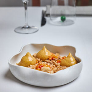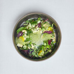 Insalata di: Piselli, favette frizzanti, lime, latte di mandorla, erbette e pinoli tostati €18