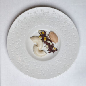 Panna cotta aromatizzata al fieno, crumble al cacao, pera e sorbetto alla pera 8€