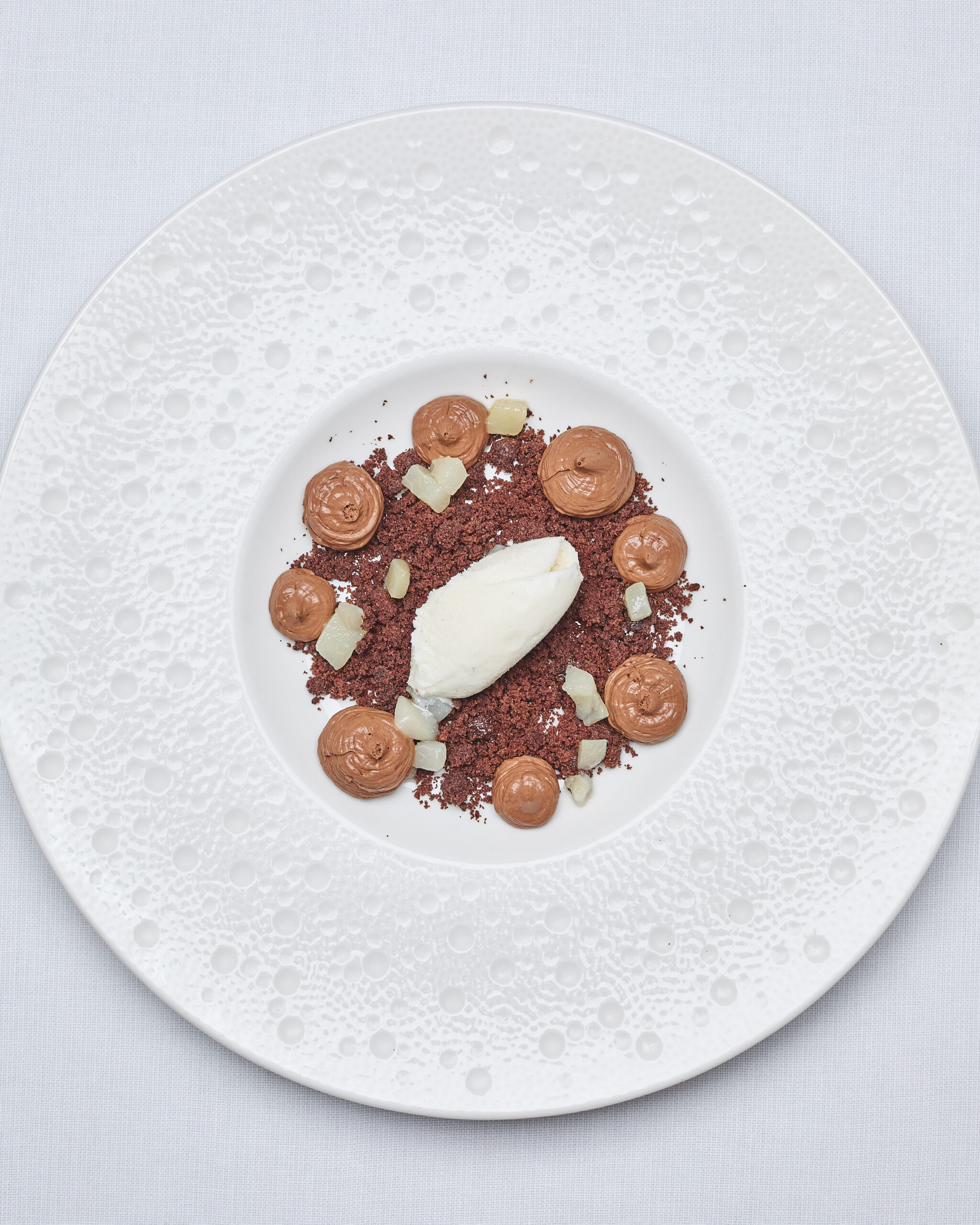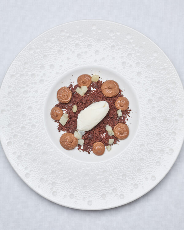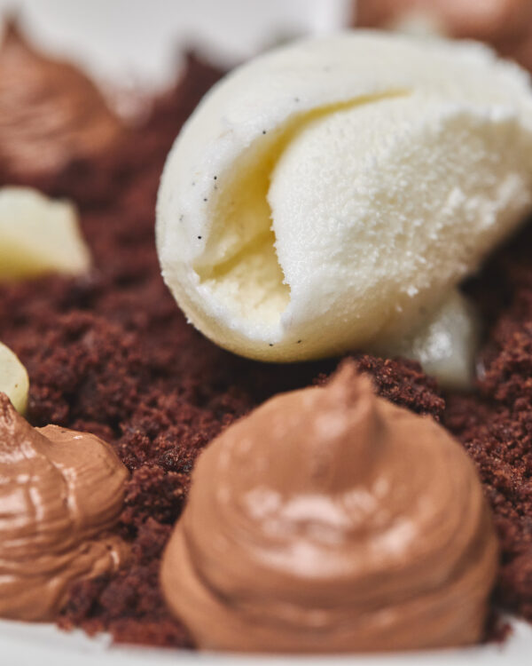 Mousse al cioccolato fondente, crumble al cacao salato, dadolata di pera cotta al gin e gelato alla vaniglia 8€